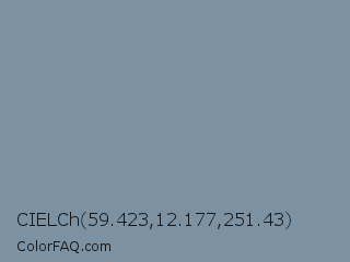 CIELCh 59.423,12.177,251.43 Color is a normal blue color and the nearest color is Shadow Blue #778ba5. Hex code #7c92a3 and RGB value is rgb(124,146,163). In RGB color space, this color is composed of 49% red, 57% green, 64% blue, In CMYK color space, this color is composed of 24% cyan, 10% magenta, 0% yellow , 36% black , In HSL color space, this color has a hue angle of 206° , 17% saturation and 56% lightness.