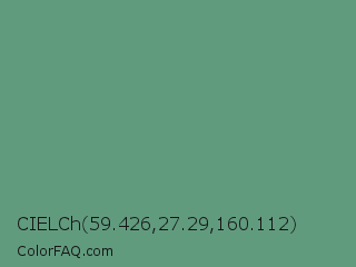 CIELCh 59.426,27.29,160.112 Color is a normal green color and the nearest color is Shiny Shamrock #5fa778. Hex code #619b7e and RGB value is rgb(97,155,126). In RGB color space, this color is composed of 38% red, 61% green, 49% blue, In CMYK color space, this color is composed of 37% cyan, 0% magenta, 19% yellow , 39% black , In HSL color space, this color has a hue angle of 150° , 23% saturation and 49% lightness.