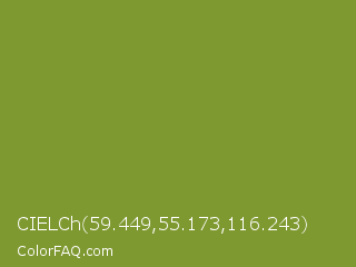 CIELCh 59.449,55.173,116.243 Color is a normal lime color and the nearest color is Wasabi #788a25. Hex code #7f9931 and RGB value is rgb(127,153,49). In RGB color space, this color is composed of 50% red, 60% green, 19% blue, In CMYK color space, this color is composed of 17% cyan, 0% magenta, 68% yellow , 40% black , In HSL color space, this color has a hue angle of 75° , 51% saturation and 40% lightness.