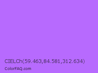 CIELCh 59.463,84.581,312.634 Color is a light purple color and the nearest color is Lavender #b57edc. Hex code #b76afe and RGB value is rgb(183,106,254). In RGB color space, this color is composed of 72% red, 42% green, 100% blue, In CMYK color space, this color is composed of 28% cyan, 58% magenta, 0% yellow , 0% black , In HSL color space, this color has a hue angle of 271° , 99% saturation and 71% lightness.