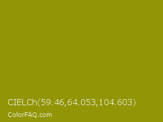CIELCh 59.46,64.053,104.603 Color is a dark yellow color and the nearest color is Dark Yellow #9b870c. Hex code #919506 and RGB value is rgb(145,149,6). In RGB color space, this color is composed of 57% red, 58% green, 2% blue, In CMYK color space, this color is composed of 3% cyan, 0% magenta, 96% yellow , 42% black , In HSL color space, this color has a hue angle of 62° , 92% saturation and 30% lightness.