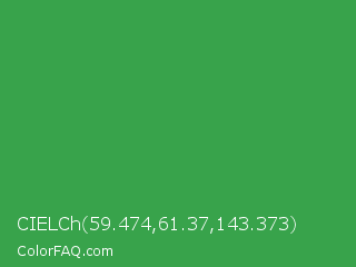 CIELCh 59.474,61.37,143.373 Color is a normal green color and the nearest color is Chateau Green #40a860. Hex code #38a34b and RGB value is rgb(56,163,75). In RGB color space, this color is composed of 22% red, 64% green, 29% blue, In CMYK color space, this color is composed of 66% cyan, 0% magenta, 54% yellow , 36% black , In HSL color space, this color has a hue angle of 131° , 49% saturation and 43% lightness.