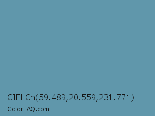 CIELCh 59.489,20.559,231.771 Color is a normal blue color and the nearest color is Hippie Blue #589aaf. Hex code #6097ab and RGB value is rgb(96,151,171). In RGB color space, this color is composed of 38% red, 59% green, 67% blue, In CMYK color space, this color is composed of 44% cyan, 12% magenta, 0% yellow , 33% black , In HSL color space, this color has a hue angle of 196° , 31% saturation and 52% lightness.
