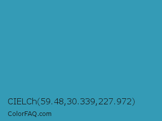 CIELCh 59.48,30.339,227.972 Color is a normal cyan color and the nearest color is Boston Blue #3b91b4. Hex code #349bb6 and RGB value is rgb(52,155,182). In RGB color space, this color is composed of 20% red, 61% green, 71% blue, In CMYK color space, this color is composed of 71% cyan, 15% magenta, 0% yellow , 29% black , In HSL color space, this color has a hue angle of 192° , 56% saturation and 46% lightness.