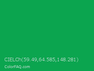 CIELCh 59.49,64.585,148.281 Color is a normal green color and the nearest color is Green Pigment #00a550. Hex code #0ba550 and RGB value is rgb(11,165,80). In RGB color space, this color is composed of 4% red, 65% green, 31% blue, In CMYK color space, this color is composed of 93% cyan, 0% magenta, 52% yellow , 35% black , In HSL color space, this color has a hue angle of 147° , 88% saturation and 35% lightness.