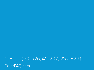 CIELCh 59.526,41.207,252.823 Color is a normal blue color and the nearest color is Rich Electric Blue #0892d0. Hex code #0a99d4 and RGB value is rgb(10,153,212). In RGB color space, this color is composed of 4% red, 60% green, 83% blue, In CMYK color space, this color is composed of 95% cyan, 28% magenta, 0% yellow , 17% black , In HSL color space, this color has a hue angle of 198° , 91% saturation and 44% lightness.
