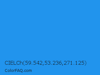 CIELCh 59.542,53.236,271.125 Color is a normal blue color and the nearest color is Button Blue #24a0ed. Hex code #2194ed and RGB value is rgb(33,148,237). In RGB color space, this color is composed of 13% red, 58% green, 93% blue, In CMYK color space, this color is composed of 86% cyan, 38% magenta, 0% yellow , 7% black , In HSL color space, this color has a hue angle of 206° , 85% saturation and 53% lightness.