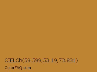 CIELCh 59.599,53.19,73.831 Color is a normal orange color and the nearest color is University Of California Gold #b78727. Hex code #be8432 and RGB value is rgb(190,132,50). In RGB color space, this color is composed of 75% red, 52% green, 20% blue, In CMYK color space, this color is composed of 0% cyan, 31% magenta, 74% yellow , 25% black , In HSL color space, this color has a hue angle of 35° , 58% saturation and 47% lightness.