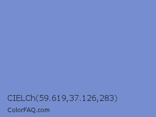 CIELCh 59.619,37.126,283 Color is a light blue color and the nearest color is Dark Pastel Blue #779ecb. Hex code #768ecf and RGB value is rgb(118,142,207). In RGB color space, this color is composed of 46% red, 56% green, 81% blue, In CMYK color space, this color is composed of 43% cyan, 31% magenta, 0% yellow , 19% black , In HSL color space, this color has a hue angle of 224° , 48% saturation and 64% lightness.