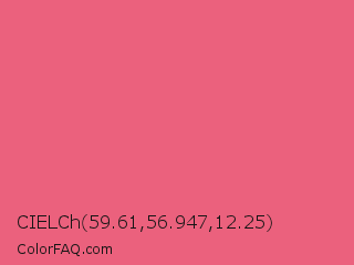 CIELCh 59.61,56.947,12.25 Color is a light red color and the nearest color is Dark Pink #e75480. Hex code #eb617d and RGB value is rgb(235,97,125). In RGB color space, this color is composed of 92% red, 38% green, 49% blue, In CMYK color space, this color is composed of 0% cyan, 59% magenta, 47% yellow , 8% black , In HSL color space, this color has a hue angle of 348° , 78% saturation and 65% lightness.