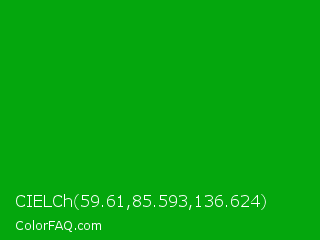 CIELCh 59.61,85.593,136.624 Color is a normal green color and the nearest color is Islamic Green #009000. Hex code #04a70d and RGB value is rgb(4,167,13). In RGB color space, this color is composed of 2% red, 65% green, 5% blue, In CMYK color space, this color is composed of 98% cyan, 0% magenta, 92% yellow , 35% black , In HSL color space, this color has a hue angle of 123° , 95% saturation and 34% lightness.