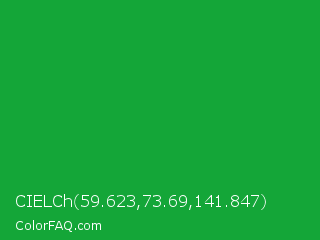 CIELCh 59.623,73.69,141.847 Color is a normal green color and the nearest color is Green Pantone #00ad43. Hex code #14a638 and RGB value is rgb(20,166,56). In RGB color space, this color is composed of 8% red, 65% green, 22% blue, In CMYK color space, this color is composed of 88% cyan, 0% magenta, 66% yellow , 35% black , In HSL color space, this color has a hue angle of 135° , 78% saturation and 36% lightness.