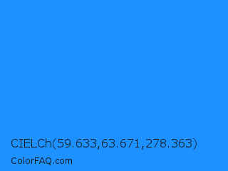 CIELCh 59.633,63.671,278.363 Color is a normal blue color and the nearest color is Dodger Blue #1e90ff. Hex code #1c91ff and RGB value is rgb(28,145,255). In RGB color space, this color is composed of 11% red, 57% green, 100% blue, In CMYK color space, this color is composed of 89% cyan, 43% magenta, 0% yellow , 0% black , In HSL color space, this color has a hue angle of 209° , 100% saturation and 55% lightness.