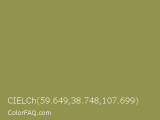 CIELCh 59.649,38.748,107.699 Color is a normal yellow color and the nearest color is Moss Green #8a9a5b. Hex code #91944d and RGB value is rgb(145,148,77). In RGB color space, this color is composed of 57% red, 58% green, 30% blue, In CMYK color space, this color is composed of 2% cyan, 0% magenta, 48% yellow , 42% black , In HSL color space, this color has a hue angle of 63° , 32% saturation and 44% lightness.
