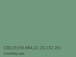 CIELCh 59.684,22.23,152.29 Color is a normal green color and the nearest color is Laurel #749378. Hex code #71997d and RGB value is rgb(113,153,125). In RGB color space, this color is composed of 44% red, 60% green, 49% blue, In CMYK color space, this color is composed of 26% cyan, 0% magenta, 18% yellow , 40% black , In HSL color space, this color has a hue angle of 138° , 16% saturation and 52% lightness.