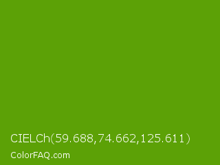 CIELCh 59.688,74.662,125.611 Color is a normal green color and the nearest color is Christi #67a712. Hex code #5ca106 and RGB value is rgb(92,161,6). In RGB color space, this color is composed of 36% red, 63% green, 2% blue, In CMYK color space, this color is composed of 43% cyan, 0% magenta, 96% yellow , 37% black , In HSL color space, this color has a hue angle of 87° , 93% saturation and 33% lightness.