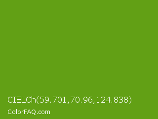 CIELCh 59.701,70.96,124.838 Color is a normal green color and the nearest color is Christi #67a712. Hex code #62a015 and RGB value is rgb(98,160,21). In RGB color space, this color is composed of 38% red, 63% green, 8% blue, In CMYK color space, this color is composed of 39% cyan, 0% magenta, 87% yellow , 37% black , In HSL color space, this color has a hue angle of 87° , 77% saturation and 35% lightness.