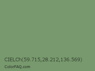 CIELCh 59.715,28.212,136.569 Color is a normal green color and the nearest color is Laurel #749378. Hex code #77996d and RGB value is rgb(119,153,109). In RGB color space, this color is composed of 47% red, 60% green, 43% blue, In CMYK color space, this color is composed of 22% cyan, 0% magenta, 29% yellow , 40% black , In HSL color space, this color has a hue angle of 106° , 18% saturation and 51% lightness.