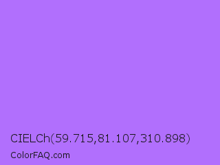 CIELCh 59.715,81.107,310.898 Color is a light violet color and the nearest color is Lavender #b57edc. Hex code #b16ffd and RGB value is rgb(177,111,253). In RGB color space, this color is composed of 69% red, 44% green, 99% blue, In CMYK color space, this color is composed of 30% cyan, 56% magenta, 0% yellow , 1% black , In HSL color space, this color has a hue angle of 268° , 97% saturation and 71% lightness.