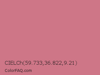 CIELCh 59.733,36.822,9.21 Color is a light red color and the nearest color is Charm #d47494. Hex code #ce7687 and RGB value is rgb(206,118,135). In RGB color space, this color is composed of 81% red, 46% green, 53% blue, In CMYK color space, this color is composed of 0% cyan, 43% magenta, 34% yellow , 19% black , In HSL color space, this color has a hue angle of 348° , 47% saturation and 64% lightness.
