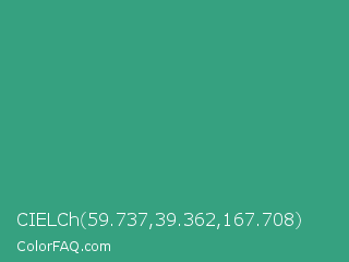 CIELCh 59.737,39.362,167.708 Color is a normal green color and the nearest color is Zomp #39a78e. Hex code #36a180 and RGB value is rgb(54,161,128). In RGB color space, this color is composed of 21% red, 63% green, 50% blue, In CMYK color space, this color is composed of 66% cyan, 0% magenta, 20% yellow , 37% black , In HSL color space, this color has a hue angle of 161° , 50% saturation and 42% lightness.