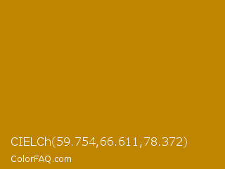 CIELCh 59.754,66.611,78.372 Color is a normal orange color and the nearest color is Pirate Gold #ba7f03. Hex code #bf8500 and RGB value is rgb(191,133,0). In RGB color space, this color is composed of 75% red, 52% green, 0% blue, In CMYK color space, this color is composed of 0% cyan, 30% magenta, 100% yellow , 25% black , In HSL color space, this color has a hue angle of 42° , 100% saturation and 37% lightness.