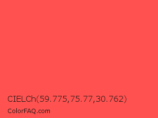CIELCh 59.775,75.77,30.762 Color is a light red color and the nearest color is Red Orange #ff5349. Hex code #ff5250 and RGB value is rgb(255,82,80). In RGB color space, this color is composed of 100% red, 32% green, 31% blue, In CMYK color space, this color is composed of 0% cyan, 68% magenta, 69% yellow , 0% black , In HSL color space, this color has a hue angle of 1° , 100% saturation and 66% lightness.