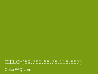 CIELCh 59.782,66.75,116.587 Color is a normal lime color and the nearest color is Limeade #6f9d02. Hex code #799c11 and RGB value is rgb(121,156,17). In RGB color space, this color is composed of 47% red, 61% green, 7% blue, In CMYK color space, this color is composed of 22% cyan, 0% magenta, 89% yellow , 39% black , In HSL color space, this color has a hue angle of 75° , 80% saturation and 34% lightness.