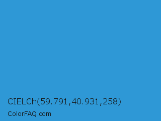 CIELCh 59.791,40.931,258 Color is a normal blue color and the nearest color is Curious Blue #2596d1. Hex code #2e98d6 and RGB value is rgb(46,152,214). In RGB color space, this color is composed of 18% red, 60% green, 84% blue, In CMYK color space, this color is composed of 79% cyan, 29% magenta, 0% yellow , 16% black , In HSL color space, this color has a hue angle of 202° , 67% saturation and 51% lightness.