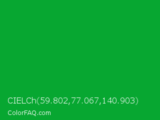 CIELCh 59.802,77.067,140.903 Color is a normal green color and the nearest color is Green Pantone #00ad43. Hex code #07a731 and RGB value is rgb(7,167,49). In RGB color space, this color is composed of 3% red, 65% green, 19% blue, In CMYK color space, this color is composed of 96% cyan, 0% magenta, 71% yellow , 35% black , In HSL color space, this color has a hue angle of 136° , 92% saturation and 34% lightness.