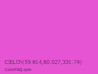 CIELCh 59.814,80.027,331.79 Color is a light magenta color and the nearest color is Purple Pizzazz #fe4eda. Hex code #e654d4 and RGB value is rgb(230,84,212). In RGB color space, this color is composed of 90% red, 33% green, 83% blue, In CMYK color space, this color is composed of 0% cyan, 63% magenta, 8% yellow , 10% black , In HSL color space, this color has a hue angle of 307° , 74% saturation and 62% lightness.