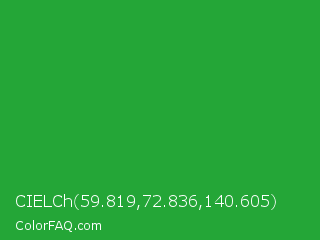 CIELCh 59.819,72.836,140.605 Color is a normal green color and the nearest color is Wageningen Green #34b233. Hex code #24a637 and RGB value is rgb(36,166,55). In RGB color space, this color is composed of 14% red, 65% green, 22% blue, In CMYK color space, this color is composed of 78% cyan, 0% magenta, 67% yellow , 35% black , In HSL color space, this color has a hue angle of 129° , 64% saturation and 40% lightness.