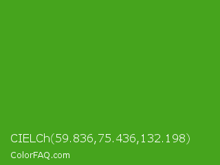 CIELCh 59.836,75.436,132.198 Color is a normal green color and the nearest color is Kelly Green #4cbb17. Hex code #46a41d and RGB value is rgb(70,164,29). In RGB color space, this color is composed of 27% red, 64% green, 11% blue, In CMYK color space, this color is composed of 57% cyan, 0% magenta, 82% yellow , 36% black , In HSL color space, this color has a hue angle of 102° , 70% saturation and 38% lightness.