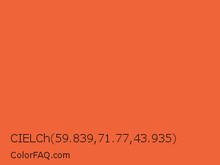 CIELCh 59.839,71.77,43.935 Color is a normal red color and the nearest color is Orange Soda #fa5b3d. Hex code #f0643a and RGB value is rgb(240,100,58). In RGB color space, this color is composed of 94% red, 39% green, 23% blue, In CMYK color space, this color is composed of 0% cyan, 58% magenta, 76% yellow , 6% black , In HSL color space, this color has a hue angle of 14° , 86% saturation and 58% lightness.