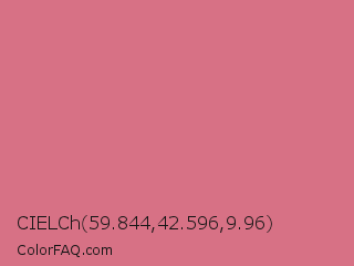 CIELCh 59.844,42.596,9.96 Color is a light red color and the nearest color is Pale Red Violet #db7093. Hex code #d77185 and RGB value is rgb(215,113,133). In RGB color space, this color is composed of 84% red, 44% green, 52% blue, In CMYK color space, this color is composed of 0% cyan, 47% magenta, 38% yellow , 16% black , In HSL color space, this color has a hue angle of 348° , 56% saturation and 64% lightness.