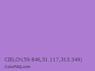 CIELCh 59.846,51.117,313.349 Color is a light purple color and the nearest color is Lavender #b57edc. Hex code #ad7cd2 and RGB value is rgb(173,124,210). In RGB color space, this color is composed of 68% red, 49% green, 82% blue, In CMYK color space, this color is composed of 18% cyan, 41% magenta, 0% yellow , 18% black , In HSL color space, this color has a hue angle of 274° , 49% saturation and 65% lightness.