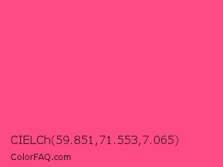 CIELCh 59.851,71.553,7.065 Color is a light rose color and the nearest color is Sasquatch Socks #ff4681. Hex code #ff4b84 and RGB value is rgb(255,75,132). In RGB color space, this color is composed of 100% red, 29% green, 52% blue, In CMYK color space, this color is composed of 0% cyan, 71% magenta, 48% yellow , 0% black , In HSL color space, this color has a hue angle of 341° , 100% saturation and 65% lightness.