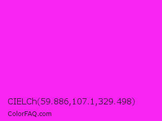 CIELCh 59.886,107.1,329.498 Color is a normal magenta color and the nearest color is Hot Magenta #ff1dce. Hex code #fa24f2 and RGB value is rgb(250,36,242). In RGB color space, this color is composed of 98% red, 14% green, 95% blue, In CMYK color space, this color is composed of 0% cyan, 86% magenta, 3% yellow , 2% black , In HSL color space, this color has a hue angle of 302° , 96% saturation and 56% lightness.