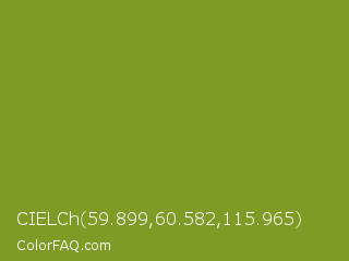 CIELCh 59.899,60.582,115.965 Color is a normal lime color and the nearest color is Wasabi #788a25. Hex code #7e9b25 and RGB value is rgb(126,155,37). In RGB color space, this color is composed of 49% red, 61% green, 15% blue, In CMYK color space, this color is composed of 19% cyan, 0% magenta, 76% yellow , 39% black , In HSL color space, this color has a hue angle of 75° , 61% saturation and 38% lightness.
