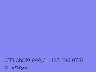 CIELCh 59.899,61.427,296.075 Color is a light blue color and the nearest color is Chetwode Blue #8581d9. Hex code #8385f2 and RGB value is rgb(131,133,242). In RGB color space, this color is composed of 51% red, 52% green, 95% blue, In CMYK color space, this color is composed of 46% cyan, 45% magenta, 0% yellow , 5% black , In HSL color space, this color has a hue angle of 239° , 81% saturation and 73% lightness.