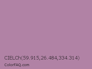 CIELCh 59.915,26.484,334.314 Color is a normal magenta color and the nearest color is Opera Mauve #b784a7. Hex code #b182a5 and RGB value is rgb(177,130,165). In RGB color space, this color is composed of 69% red, 51% green, 65% blue, In CMYK color space, this color is composed of 0% cyan, 27% magenta, 7% yellow , 31% black , In HSL color space, this color has a hue angle of 315° , 23% saturation and 60% lightness.