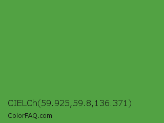 CIELCh 59.925,59.8,136.371 Color is a normal green color and the nearest color is Apple #4fa83d. Hex code #52a243 and RGB value is rgb(82,162,67). In RGB color space, this color is composed of 32% red, 64% green, 26% blue, In CMYK color space, this color is composed of 49% cyan, 0% magenta, 59% yellow , 36% black , In HSL color space, this color has a hue angle of 111° , 41% saturation and 45% lightness.