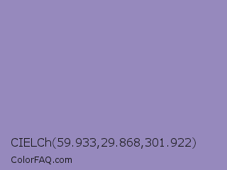 CIELCh 59.933,29.868,301.922 Color is a light indigo color and the nearest color is Lavender Purple #967bb6. Hex code #9689bd and RGB value is rgb(150,137,189). In RGB color space, this color is composed of 59% red, 54% green, 74% blue, In CMYK color space, this color is composed of 21% cyan, 28% magenta, 0% yellow , 26% black , In HSL color space, this color has a hue angle of 255° , 28% saturation and 64% lightness.
