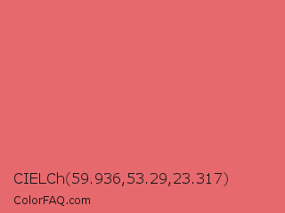 CIELCh 59.936,53.29,23.317 Color is a light red color and the nearest color is Light Carmine Pink #e66771. Hex code #e6696e and RGB value is rgb(230,105,110). In RGB color space, this color is composed of 90% red, 41% green, 43% blue, In CMYK color space, this color is composed of 0% cyan, 54% magenta, 52% yellow , 10% black , In HSL color space, this color has a hue angle of 358° , 71% saturation and 66% lightness.