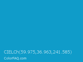 CIELCh 59.975,36.963,241.585 Color is a normal blue color and the nearest color is Rich Electric Blue #0892d0. Hex code #0f9cc9 and RGB value is rgb(15,156,201). In RGB color space, this color is composed of 6% red, 61% green, 79% blue, In CMYK color space, this color is composed of 93% cyan, 22% magenta, 0% yellow , 21% black , In HSL color space, this color has a hue angle of 195° , 86% saturation and 42% lightness.