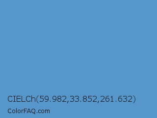 CIELCh 59.982,33.852,261.632 Color is a normal blue color and the nearest color is Danube #6093d1. Hex code #5696cb and RGB value is rgb(86,150,203). In RGB color space, this color is composed of 34% red, 59% green, 80% blue, In CMYK color space, this color is composed of 58% cyan, 26% magenta, 0% yellow , 20% black , In HSL color space, this color has a hue angle of 207° , 53% saturation and 57% lightness.