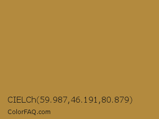 CIELCh 59.987,46.191,80.879 Color is a normal orange color and the nearest color is Alpine #af8f2c. Hex code #b38a3e and RGB value is rgb(179,138,62). In RGB color space, this color is composed of 70% red, 54% green, 24% blue, In CMYK color space, this color is composed of 0% cyan, 23% magenta, 65% yellow , 30% black , In HSL color space, this color has a hue angle of 39° , 49% saturation and 47% lightness.