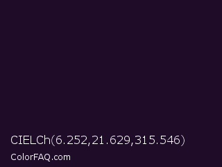 CIELCh 6.252,21.629,315.546 Color is a very dark purple color and the nearest color is Haiti #1b1035. Hex code #1e0c28 and RGB value is rgb(30,12,40). In RGB color space, this color is composed of 12% red, 5% green, 16% blue, In CMYK color space, this color is composed of 25% cyan, 70% magenta, 0% yellow , 84% black , In HSL color space, this color has a hue angle of 279° , 54% saturation and 10% lightness.