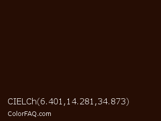 CIELCh 6.401,14.281,34.873 Color is a almost black orange color and the nearest color is Kilamanjaro #240c02. Hex code #260d04 and RGB value is rgb(38,13,4). In RGB color space, this color is composed of 15% red, 5% green, 2% blue, In CMYK color space, this color is composed of 0% cyan, 66% magenta, 89% yellow , 85% black , In HSL color space, this color has a hue angle of 16° , 81% saturation and 8% lightness.