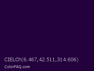 CIELCh 6.467,42.511,314.606 Color is a very dark purple color and the nearest color is Violet #240a40. Hex code #23013d and RGB value is rgb(35,1,61). In RGB color space, this color is composed of 14% red, 0% green, 24% blue, In CMYK color space, this color is composed of 43% cyan, 98% magenta, 0% yellow , 76% black , In HSL color space, this color has a hue angle of 274° , 97% saturation and 12% lightness.